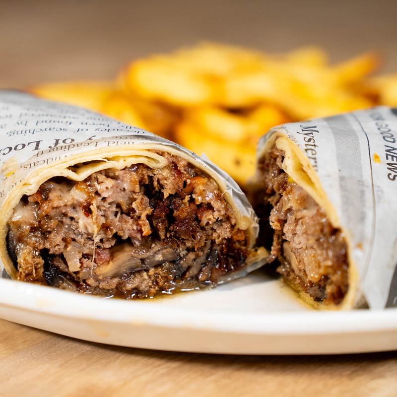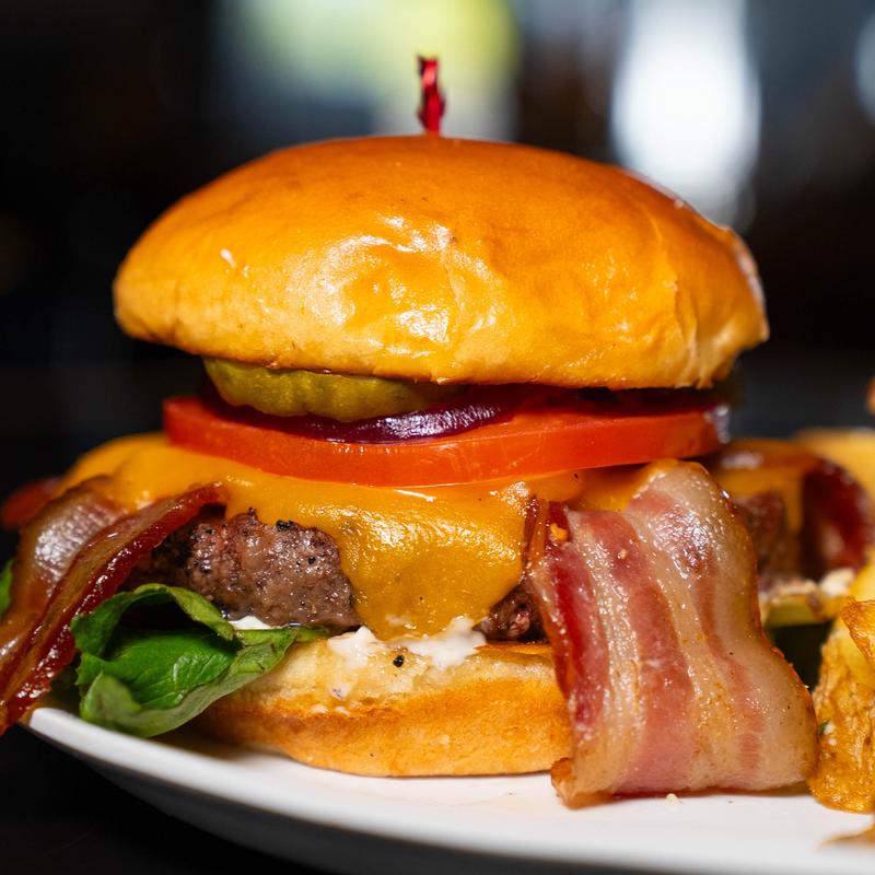 All burgers are 8 ounces of 100% black Angus ground chuck, fresh, never frozen, hand-patted, and lightly seasoned