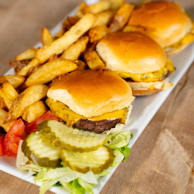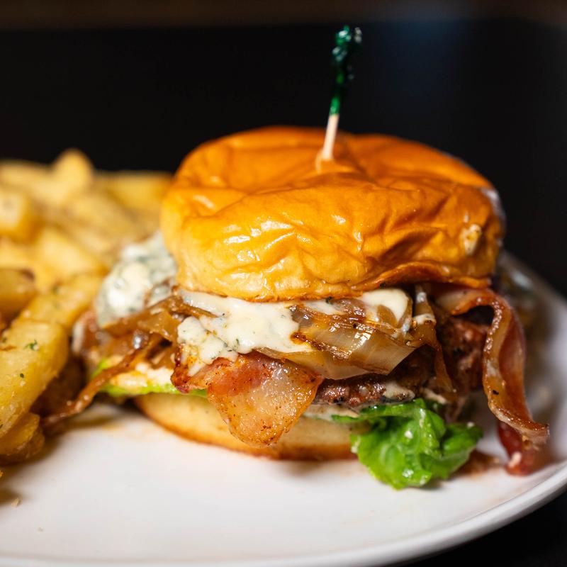 All burgers are served medium well with fresh-cut fries. For an additional charge, fries may be substituted with soup, tossed salad, side Caesar salad, coleslaw, steamed broccoli, baked cauliflower, onion rings, or homemade potato chips